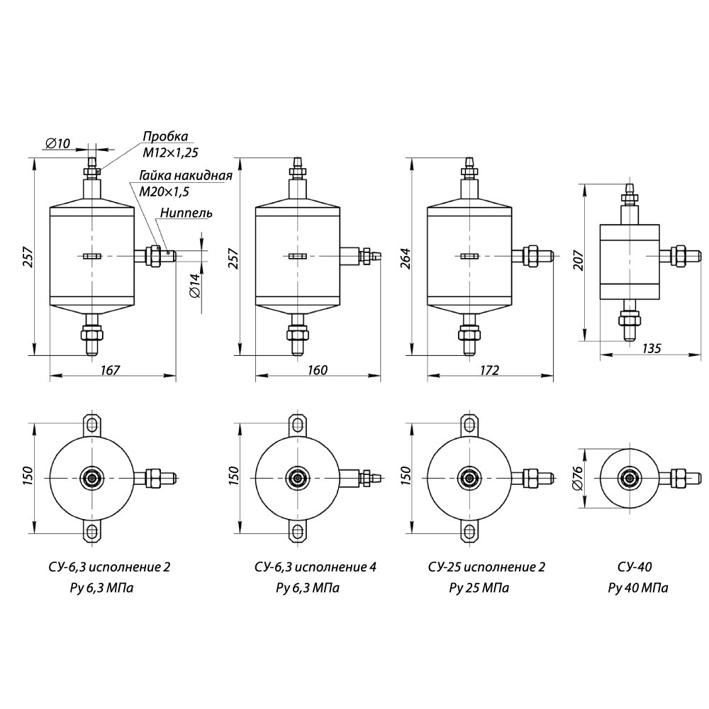 Сосуды уравнительные СУ предназначены для исключения влияния на результат измерений высоты столба жидкости в импульсной линии путем поддержания постоянного уровня жидкости в сосуде по отношению к измеряемому переменному уровню в резервуарах при измерении дифманометрами уровня жидкости в резервуарах, а также перепада давления или расхода жидкостей с температурой свыше 100 °С для обеспечения равенства плотностей жидкости в импульсных линиях. Условное обозначение: